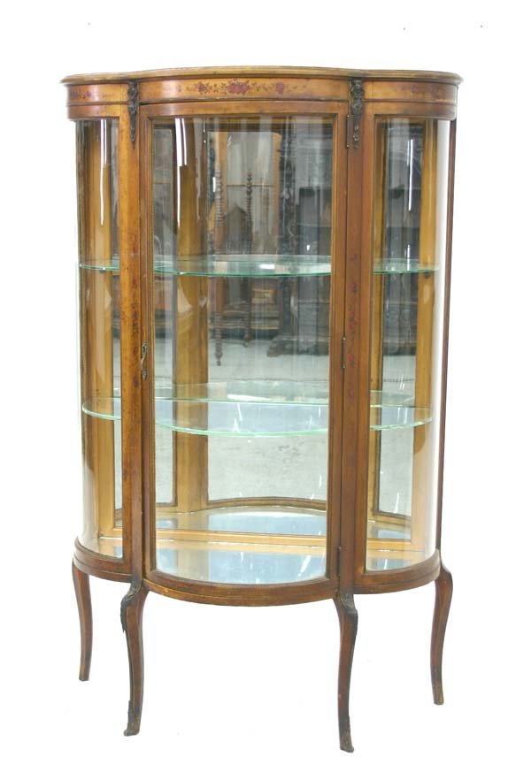 Item features satinwood inlay, curved glass sides, individual pieces of glass to front door